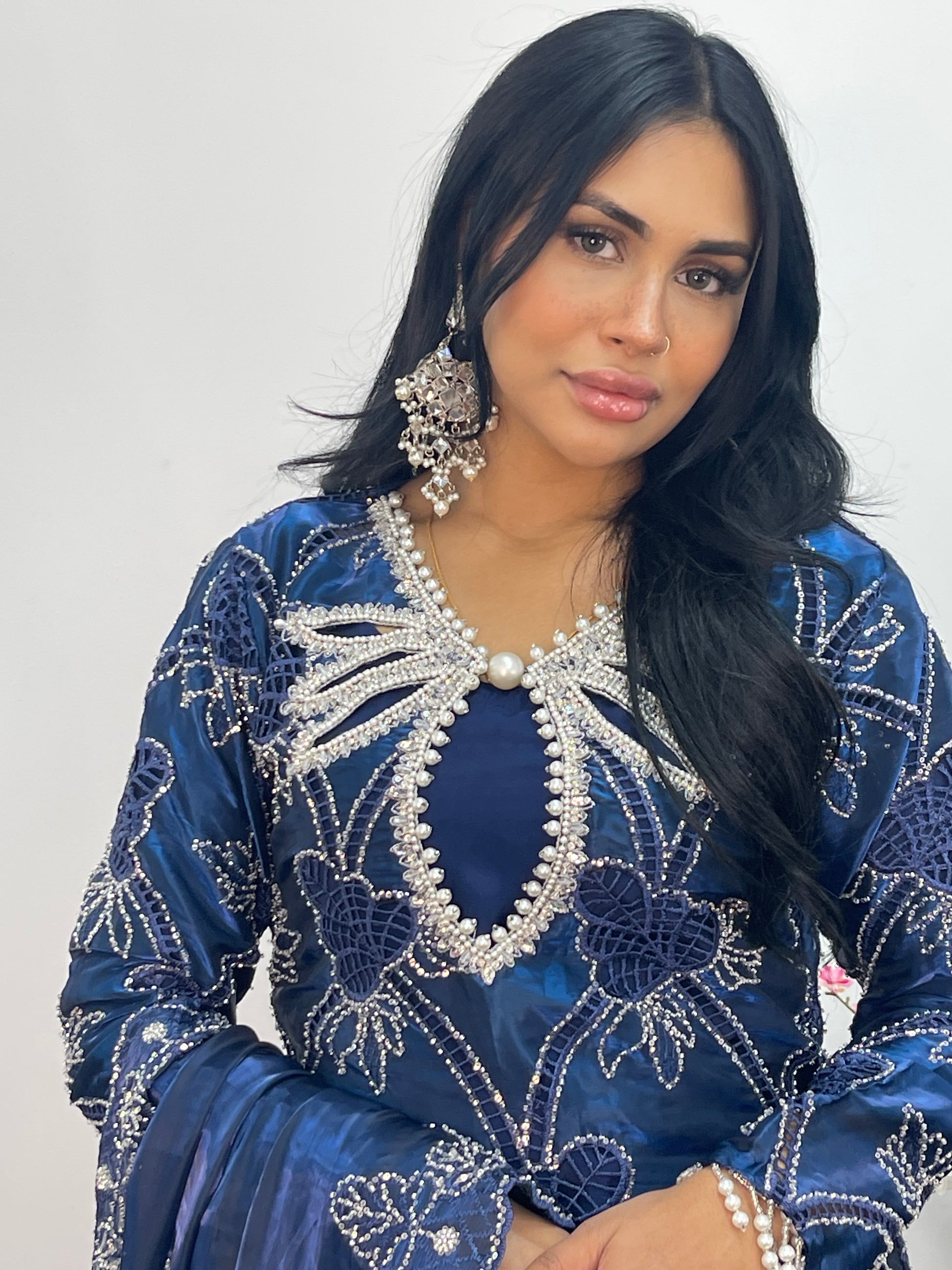 adda work on the neckline. This elegant piece features sleeves with crystal detailing and charming latkans.
