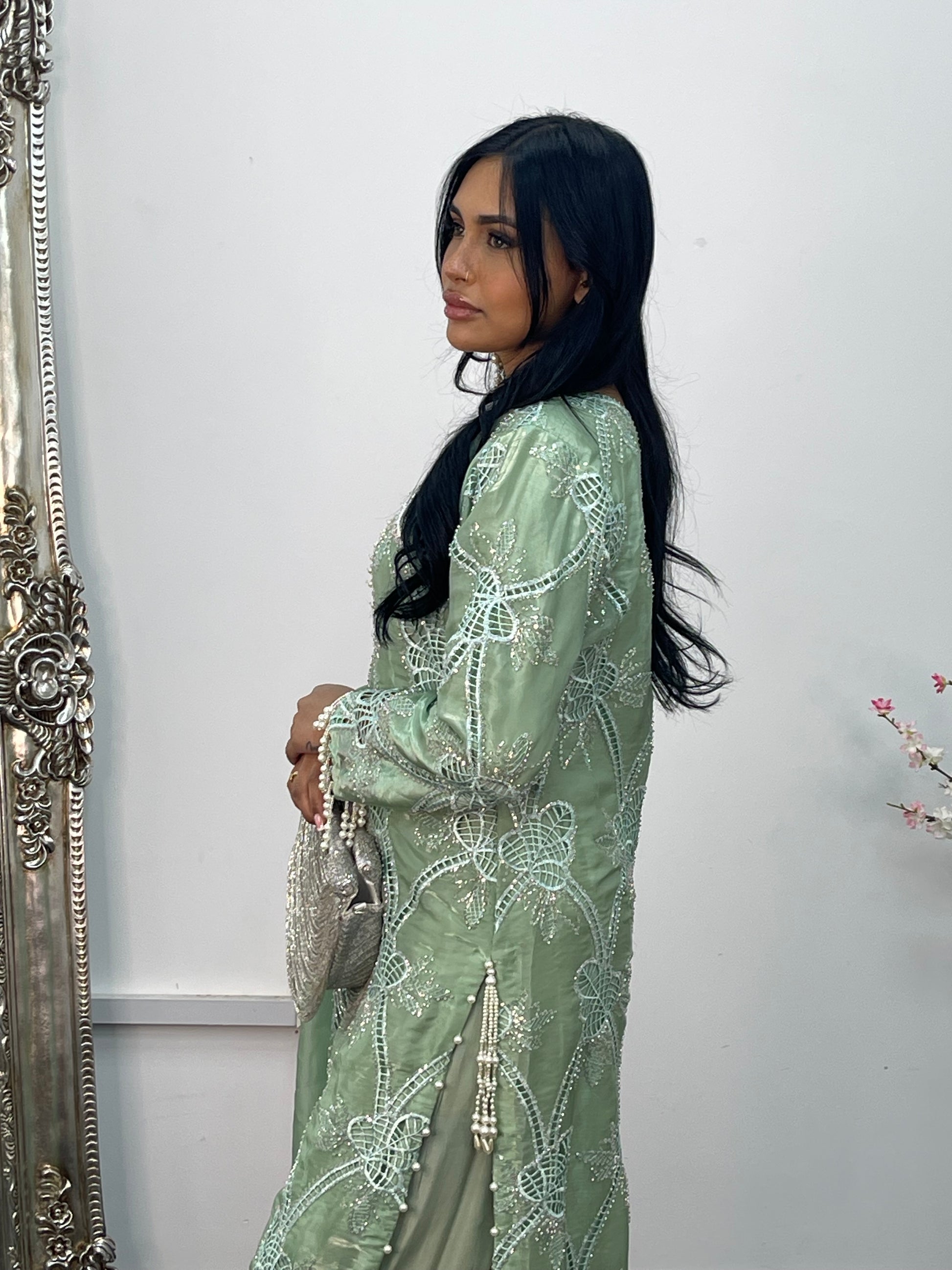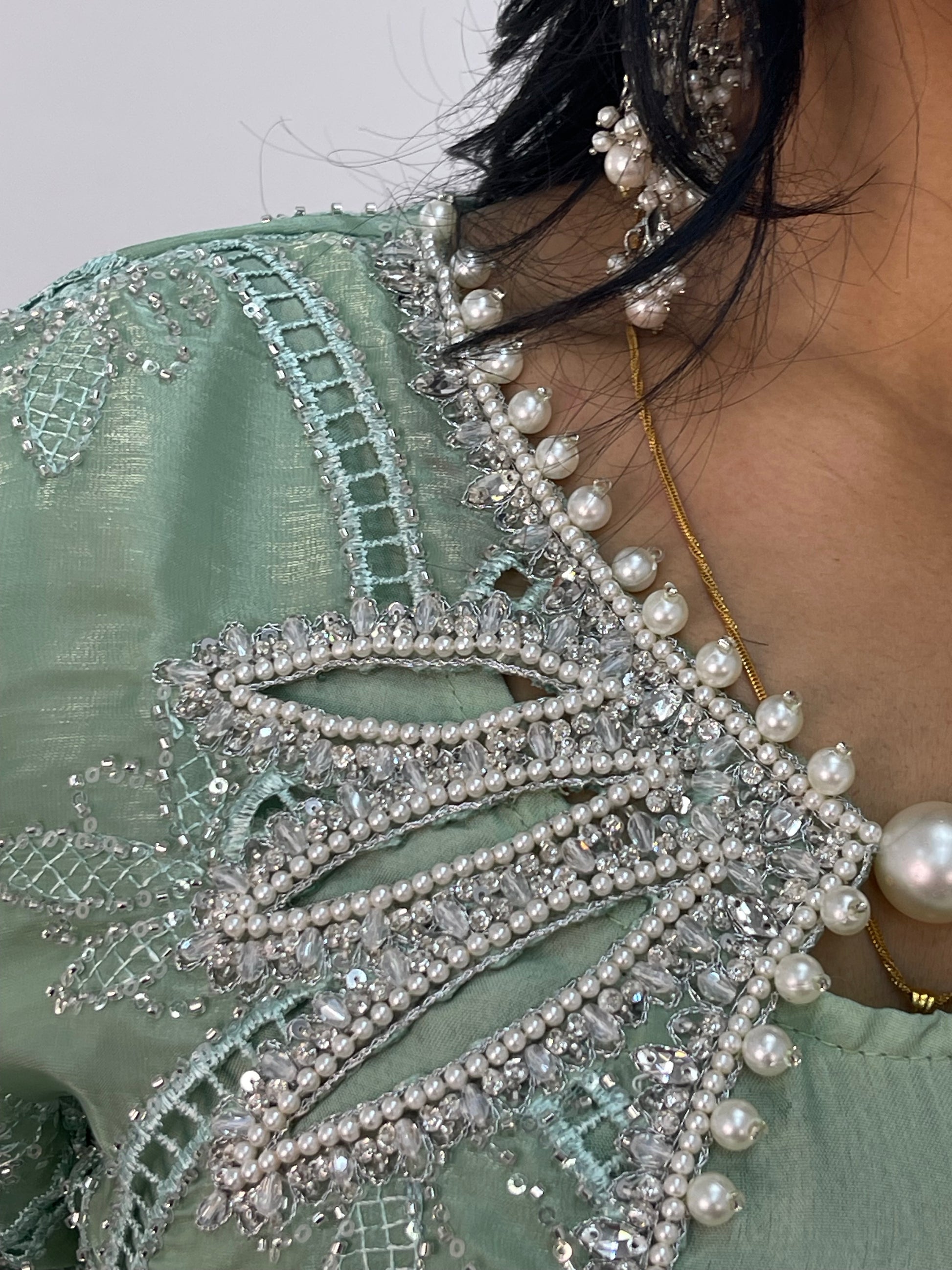 adda work on the neckline. This elegant piece features sleeves with crystal detailing and charming latkans.