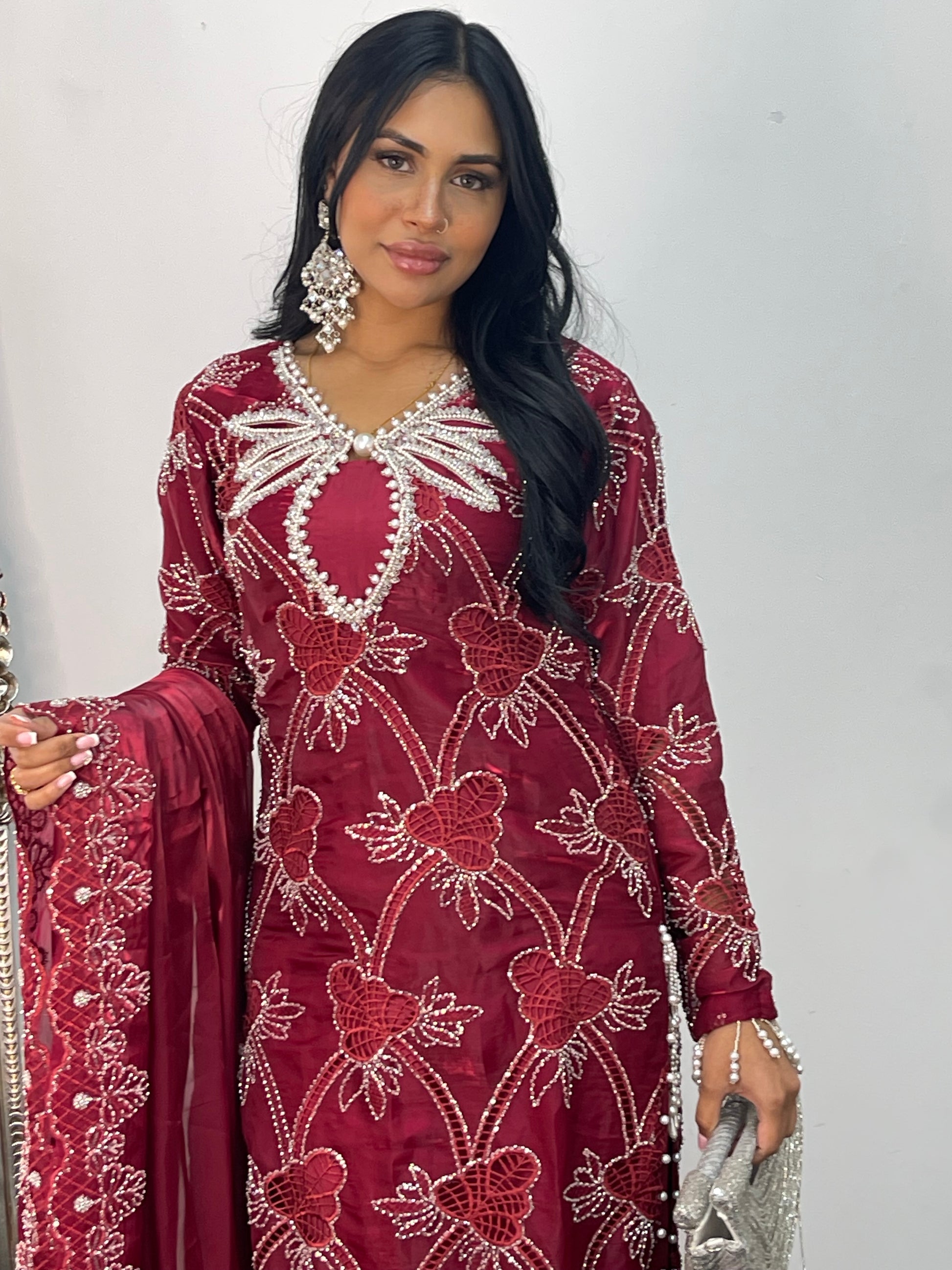 adda work on the neckline. This elegant piece features sleeves with crystal detailing and charming latkans.