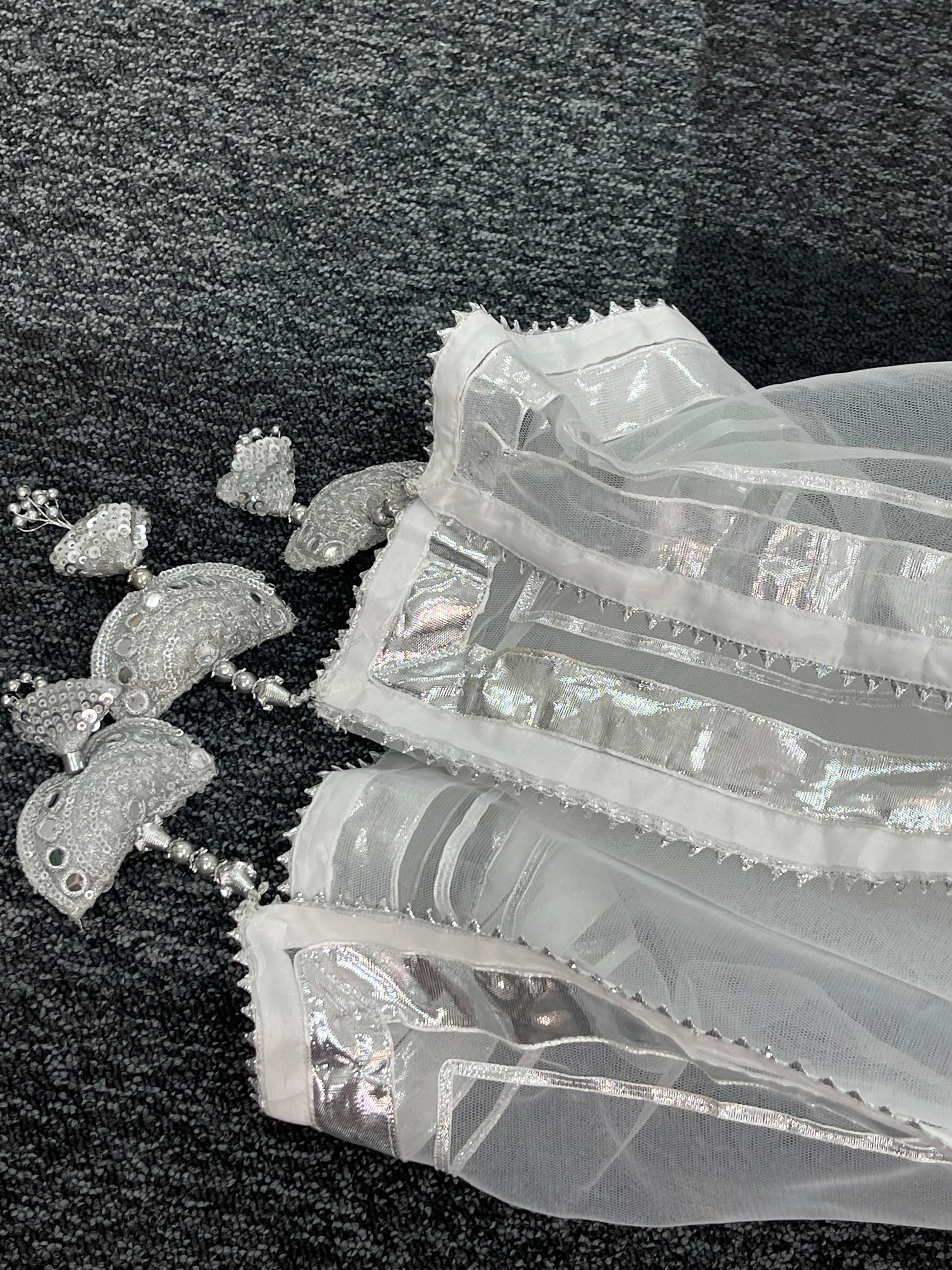 Completing the ensemble, a net dupatta embellished with delicate tassels flows beautifully.