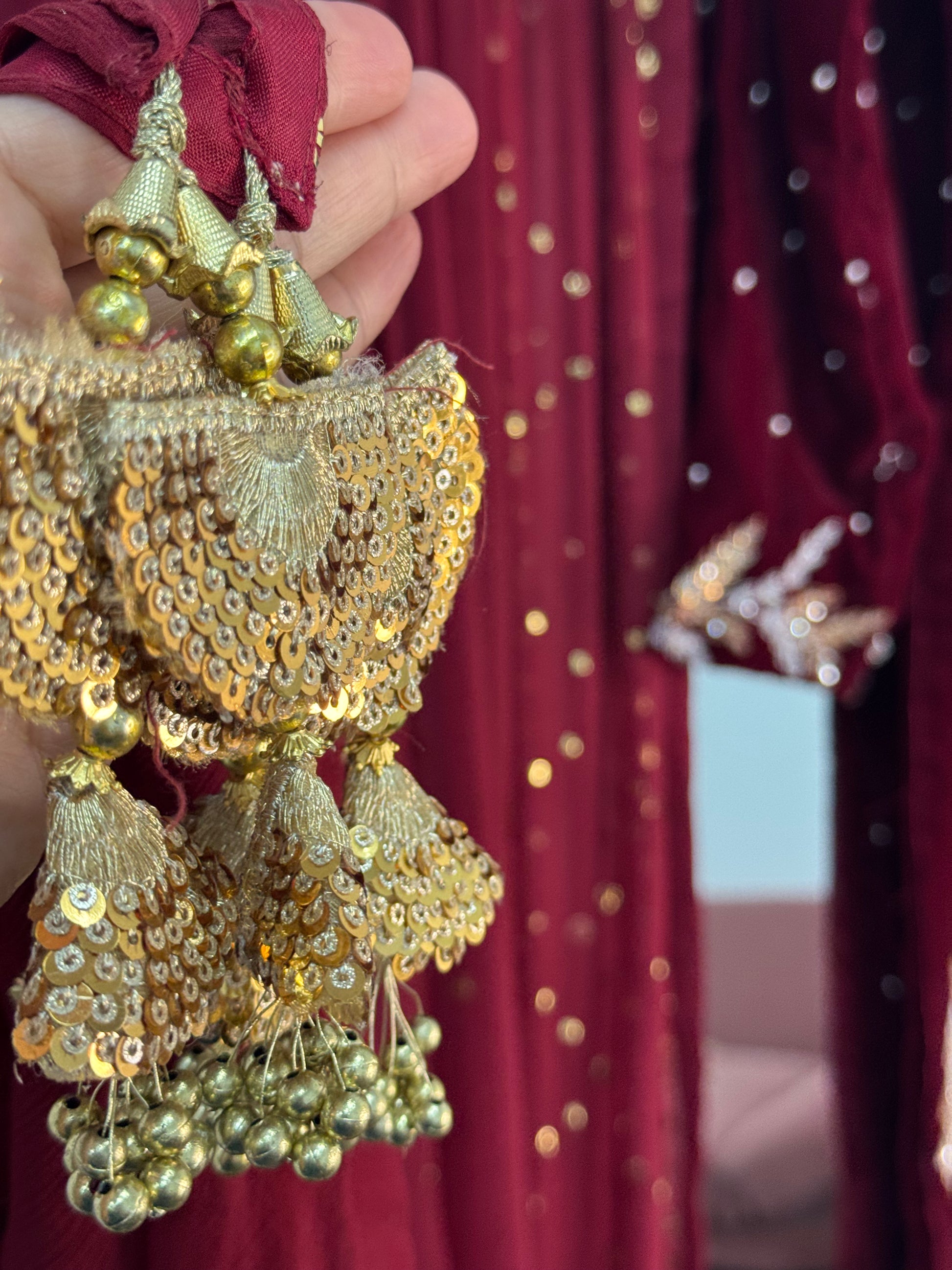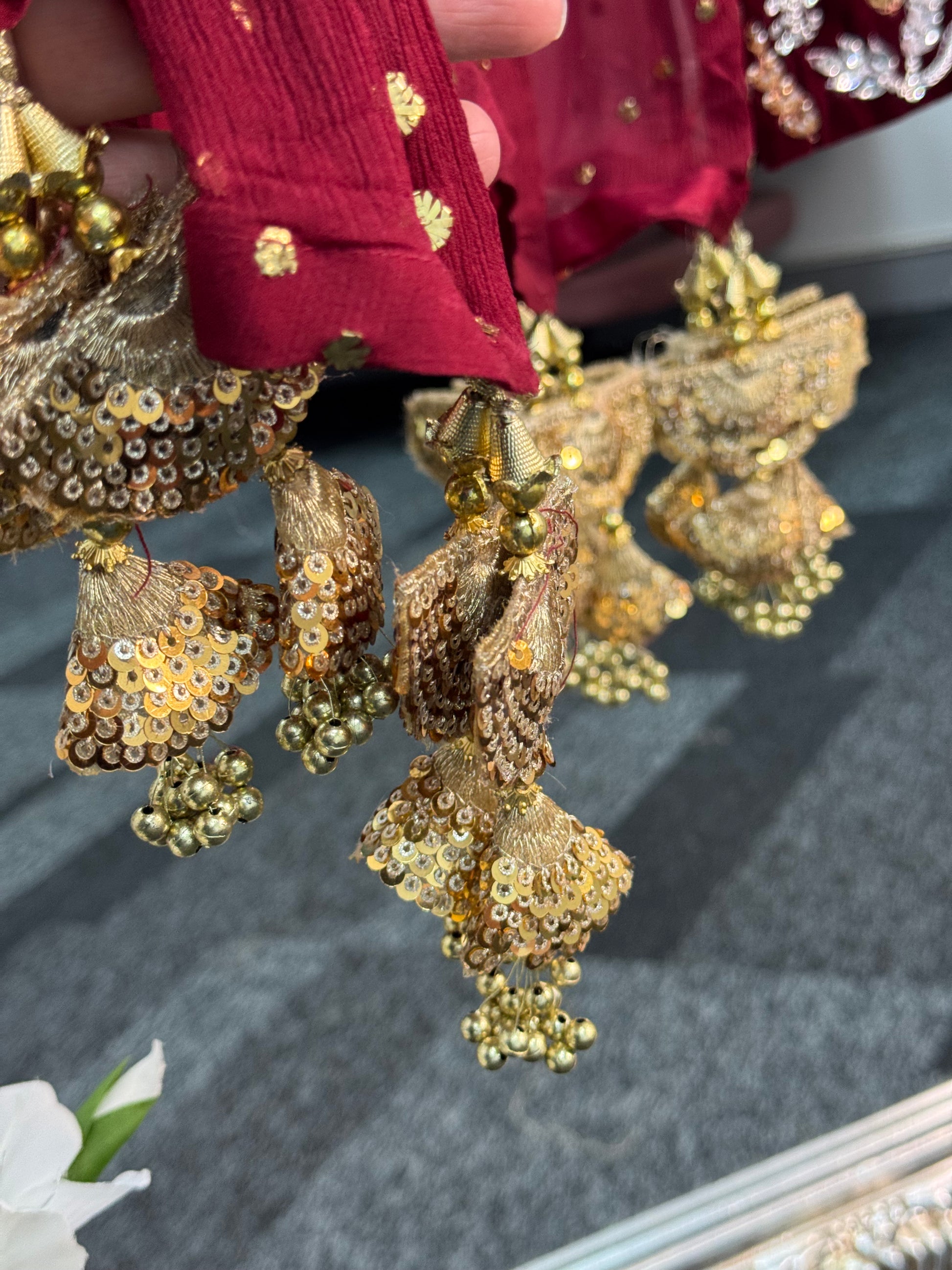 • Chiffon Dupatta: Complemented with mukesb and four tassels on the corners for added elegance